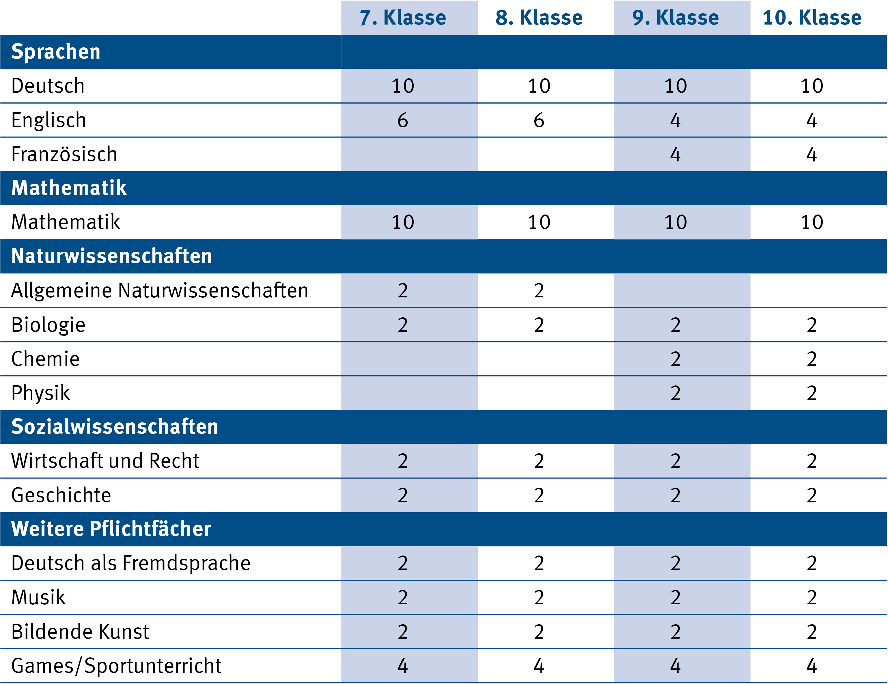 Pflichtfächer, die wöchentlich unterrichtet werden